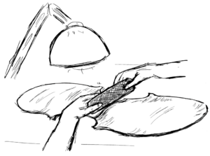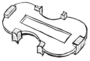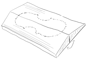 Die Unterseiten der Platten wird plan (also gerade und flach in alle Richtungen) gehobelt und dann die Kontur des Zargenkranzes (+Randüberstand) auf die Unterseite übertragen. Die Fuge dient hierbei als Mittellinie. Entlang der aufgezeichneten Linie wird ausgesägt. Mit Hohleisen und Hobeln arbeitet man die Wölbung aus den nun geigenförmigen Platten heraus.