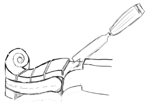 Ist der Kopf fertig geformt, wird der Wirbelkasten ausgehöhlt und es werden die umlaufenden Hohlkehlen gestochen und die Kanten gebrochen.
