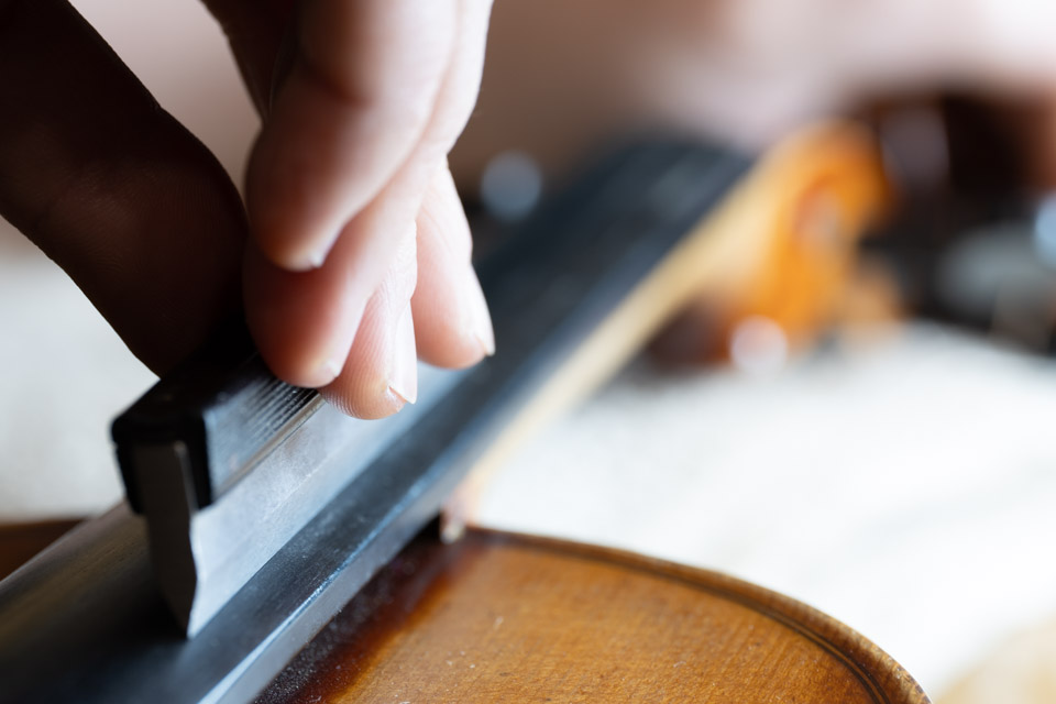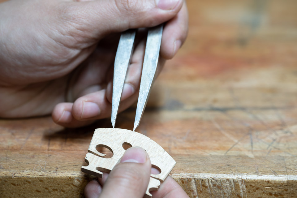 Der Steg hat gleich mehrere wichtige Aufgaben: Er hält die Saiten in Position, bestimmt deren Abstand zueinander und zum Griffbrett. Seine obere Rundung ist entscheidend dafür, wie gut die einzelne Saite mit dem Bogen zu erreichen ist. Außerdem gibt er die Schwingungen der Saiten an das Instrument weiter und hat so einen großen Einfluss auf den Klang. Seine Höhe, Dicke, Platzierung, Form und nicht zu letzt die Holzauswahl sind also ausschlaggebend dafür, wie gut ein Instrument klingt und sich spielen lässt.